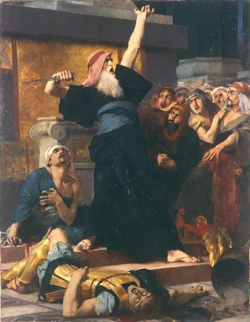 Resistance came not from the city but from the hills. In Modiin, Mattityahu, an elderly priest and a Cohen from the Hasmonean family, refused to sacrifice to an idol. In a fit of holy anger, he killed an apostate Jew and the king’s officer before fleeing to the mountains with his five sons.